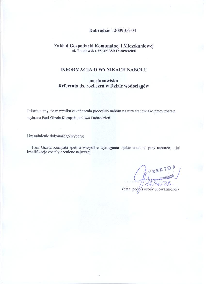 | Aktualne załączniki/zdjęcia:INFORMACJA O WYNIKACH NABORU.doc (rozmiar 23,50 KB) [Marek Witek dnia 2011-07-26 14:12:08, dokument aktualny] więcej >> Oświadczenie.doc (rozmiar 25,00 KB) [Piotr Więdłocha dnia 2011-06-30 13:16:02, dokument aktualny] więcej >> kwestionariusz osobowy.pdf (rozmiar 609,13 KB) [Piotr Więdłocha dnia 2011-06-30 13:15:30, dokument aktualny] więcej >> Nabór na samodzielne stanowisko ds. kontroli zarządczej w Urzędzie Miejskim w Dobrodzieniu.doc (rozmiar 70,50 KB) [Piotr Więdłocha dnia 2011-06-30 13:14:48, dokument aktualny] więcej >> Zarządzenie nabór II 2010.doc (rozmiar 24,50 KB) [Piotr Więdłocha dnia 2010-02-11 09:43:06, dokument aktualny] więcej >> Regulamin naboru pracowników w ZEASiP.doc (rozmiar 52,50 KB) [Piotr Więdłocha dnia 2010-02-11 09:42:55, dokument aktualny] więcej >> OGŁOSZENIE O NABORZE NA WOLNE STANOWISKO II 2010.doc (rozmiar 53,00 KB) [Piotr Więdłocha dnia 2010-02-11 09:42:45, dokument aktualny] więcej >> Kwestionariusz osobowy - wzór dla ubiegających sie o pracę.doc (rozmiar 30,50 KB) [Piotr Więdłocha dnia 2010-02-11 09:42:36, dokument aktualny] więcej >> Regulamin konkursu.doc (rozmiar 42,00 KB) [Piotr Więdłocha dnia 2010-01-18 09:38:43, dokument aktualny] więcej >> ogł. finanse - 2010.doc (rozmiar 160,00 KB) [Piotr Więdłocha dnia 2010-01-18 09:38:37, dokument aktualny] więcej >> KWESTIONARIUSZ_OSOBOWY - kandydata.doc (rozmiar 31,50 KB) [Piotr Więdłocha dnia 2010-01-18 09:38:30, dokument aktualny] więcej >> Ogłoszenie o naborze na stanowisko pracy - Przedszkole z Oddziałami Integracyjnymi w Dobrodzieniu.doc (rozmiar 42,50 KB) [Piotr Więdłocha dnia 2009-11-16 14:51:09, dokument aktualny] więcej >> Zarządzenie nabór XI 2009.doc (rozmiar 24,50 KB) [Piotr Więdłocha dnia 2009-11-05 14:57:45, dokument aktualny] więcej >> OGŁOSZENIE O NABORZE NA WOLNE STANOWISKO - ZEASIP.doc (rozmiar 53,00 KB) [Piotr Więdłocha dnia 2009-11-05 14:56:05, dokument aktualny] więcej >> Ogłoszenie o naborze na wolne stanowisko - Specjalista ds. projektów w Stowarzyszeniu LGD Kraina Dinozaurów.pdf (rozmiar 286,14 KB) [Piotr Więdłocha dnia 2009-06-29 10:33:38, dokument aktualny] więcej >> informacja o wynikach naboru.jpg (rozmiar 55,53 KB) [Piotr Więdłocha dnia 2009-06-04 10:59:29, dokument aktualny] więcej >> informacja o wynikach naboru.tif (rozmiar 2 913,77 KB) [Piotr Więdłocha dnia 2009-06-04 10:58:51, dokument aktualny] więcej >> lista kandydatów na st. referent dział wodociągów.tif (rozmiar 2 913,77 KB) [Piotr Więdłocha dnia 2009-05-27 11:43:17, dokument aktualny] więcej >> INFORMACJA O WYNIKACH NABORU - Dyrektor Zakładu Gospodarki Komunalnej i Mieszkaniowej.doc (rozmiar 27,50 KB) [Piotr Więdłocha dnia 2009-05-14 15:35:15, dokument aktualny] więcej >> Informacja o wyniku naboru - Specjalista ds. sprawozdawczości i finansów.pdf (rozmiar 364,26 KB) [Piotr Więdłocha dnia 2009-04-22 11:38:45, dokument aktualny] więcej >> Informacja o wyniku naboru - Specjalista ds. projektów.pdf (rozmiar 414,90 KB) [Piotr Więdłocha dnia 2009-04-22 11:38:33, dokument aktualny] więcej >> Informacja o wyniku naboru - Kierownik Biura LGD.pdf (rozmiar 414,19 KB) [Piotr Więdłocha dnia 2009-04-22 11:38:16, dokument aktualny] więcej >> ZGKiM - NABÓR NA WOLNE STANOWISKO PRACY - Referent ds. rozliczeń w Dziale wodociągów.doc (rozmiar 32,00 KB) [Piotr Więdłocha dnia 2009-04-20 13:05:42, dokument aktualny] więcej >> Oświadczenie.doc (rozmiar 26,50 KB) [Piotr Więdłocha dnia 2009-04-15 15:16:16, dokument aktualny] więcej >> OGŁOSZENIE O NABORZE NA WOLNE STANOWISKO - Dyrektor Zakładu Gospodarki Komunalnej i Mieszkaniowej.doc (rozmiar 52,00 KB) [Piotr Więdłocha dnia 2009-04-15 15:16:09, dokument aktualny] więcej >> informacja o wynikach naboru na stan. księgowego.tif (rozmiar 2 778,79 KB) [Piotr Więdłocha dnia 2009-04-01 10:41:47, dokument aktualny] więcej >> Zarządzenie nabór.doc (rozmiar 24,50 KB) [Piotr Więdłocha dnia 2009-03-23 13:22:23, dokument aktualny] więcej >> Zarządzenie - nabór pracowników ZEASziP 2009.doc (rozmiar 25,50 KB) [Piotr Więdłocha dnia 2009-03-23 13:22:17, dokument aktualny] więcej >> Zał-cznik Nr 1 do Zarz-dzenia 2009.doc (rozmiar 52,50 KB) [Piotr Więdłocha dnia 2009-03-23 13:22:11, dokument aktualny] więcej >> OGŁOSZENIE O NABORZE NA WOLNE STANOWISKO starszy referent ds. projektów i dotacji.doc (rozmiar 52,00 KB) [Piotr Więdłocha dnia 2009-03-23 13:22:05, dokument aktualny] więcej >> Kwestionariusz osobowy - wzór dla ubiegających sie o pracę.doc (rozmiar 30,50 KB) [Piotr Więdłocha dnia 2009-03-23 13:21:59, dokument aktualny] więcej >> Lista kandydatów spełniające wymagania formalne na wolne stanowisko księgowego.pdf (rozmiar 78,42 KB) [Piotr Więdłocha dnia 2009-03-05 07:48:57, dokument aktualny] więcej >> ogł. projekty.doc (rozmiar 143,50 KB) [Piotr Więdłocha dnia 2009-03-02 13:32:33, dokument aktualny] więcej >> ogł. kierownik biura.doc (rozmiar 140,50 KB) [Piotr Więdłocha dnia 2009-03-02 13:32:25, dokument aktualny] więcej >> ogł. finanse.doc (rozmiar 142,50 KB) [Piotr Więdłocha dnia 2009-03-02 13:32:16, dokument aktualny] więcej >> KWESTIONARIUSZ OSOBOWY.doc (rozmiar 84,50 KB) [Piotr Więdłocha dnia 2009-03-02 13:32:08, dokument aktualny] więcej >> Ogłoszenie o konkursie na kandydatów na stanowiska dyrektorów Szkół Podstawowych w Dobrodzieniu, Szemrowicach i Turzy..doc (rozmiar 56,50 KB) [Piotr Więdłocha dnia 2009-03-02 10:56:07, dokument aktualny] więcej >> INFORMACJA O WYNIKACH NABORU.doc (rozmiar 26,50 KB) [Piotr Więdłocha dnia 2009-02-17 13:16:24, dokument aktualny] więcej >> Nabór na stanowisko księgowego w Zakładzie Gospodarki Komunalnej i Mieszkaniowej w Dobrodzieniu.doc (rozmiar 40,00 KB) [Piotr Więdłocha dnia 2009-02-16 12:53:24, dokument aktualny] więcej >> LISTA KANDYDATÓW SPEŁNIAJĄCYCH WYMAGANIA FORMALNE NA SAMODZIELNE STANOWISKO DS. OBRONY CYWILNEJ, SPRAW OBRONNYCH, ZARZĄDZANIA KRYZYSOW